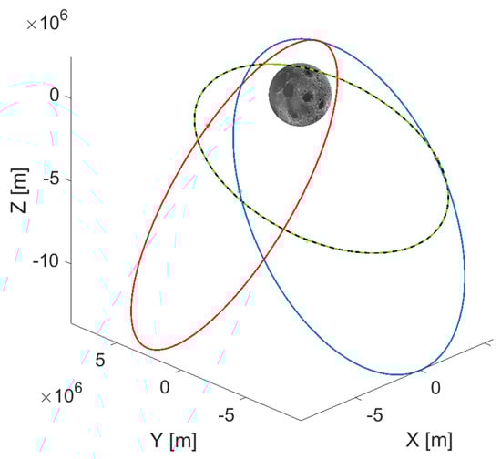 3D representation of the ELFO constellation in the Moon Inertial reference frame. Notice the apolunes located above the southern hemisphere to best service in the southern polar cap. Blue, red, black and dotted green represents the orbits of the four ELFO satellites.
