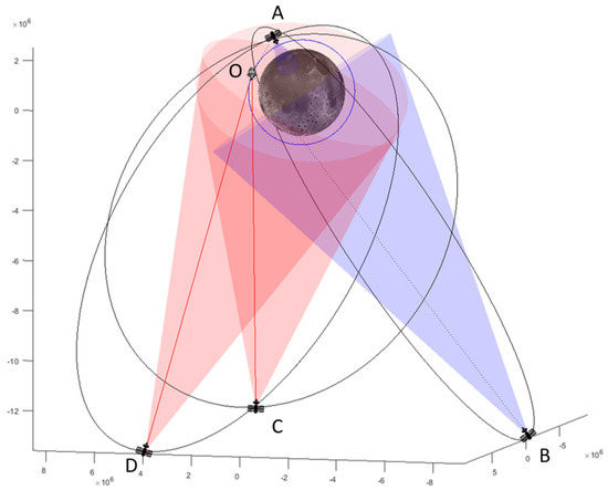 As an example, referring to Figure 2, orbiter O has visibility of ELFO satellites C and D (the vector from satellites to orbiter is inside the antenna main lobe), while it does not have visibility of satellites A (relative position vector outside the main lobe) and B (relative vector would be inside the lobe, but Moon body is between the orbiter and the satellite).
