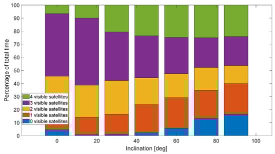 The number of visible satellites changes according to the orbital parameters of the receiver. As an example, it is possible to see from Figure 3 that the percentage of time in which full visibility (i.e., four satellites) is achieved, increases from equatorial to polar orbits. Quite interestingly, also the worst conditions (zero or just one visible satellite) increase from equatorial to polar orbits. This behavior depends on the fact that the LCNS constellation has been specifically designed for future missions to the Moon’s south pole, where the navigation performance is optimized.