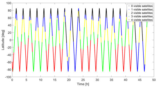 Confirmation can be obtained by looking at Figure 4. Here, the number of visible satellites is plotted as a function of the receiver latitude for a polar orbit case. The North Pole (90 degrees latitude) suffers from nearly null coverage, as opposed to the South Pole (−90 degrees), where most of the time there are three or four visible satellites. It can also be noticed that there is a 24 h periodic behavior in the visibility conditions.