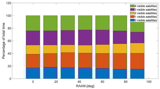 Since the case of greater interest for future missions is the South Pole exploration, also the reference orbit of the formation of satellites is considered to be on a nearly polar orbit (which is therefore periodically affected by the worst and by the best visibility conditions). The analysis in Figure 5 shows that the visibility conditions for such a kind of orbital scenario are not affected by the right ascension of the ascending node (RAAN).