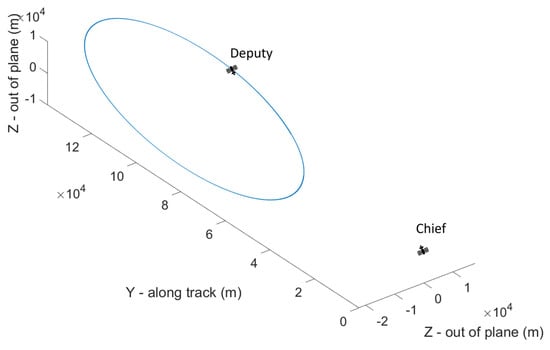 The Deputy orbit is selected in such a way that its relative motion with respect to the Chief includes most of the possible characteristics of the formation flying dynamics, so to provide more generality to the study. Specifically, an elliptical relative trajectory (semiaxes dimensions (20, 40, 20) km in the radial, along-track, and out-of-plane direction, respectively), with an along-track offset of 100 km, is considered. In Figure 6, the trajectory in the local vertical local horizontal (LVLH) reference frame is reported, where the x-axis is in the radial direction, the z-axis is out-of-plane, and the y-axis forms a right-handed frame.