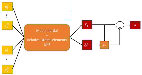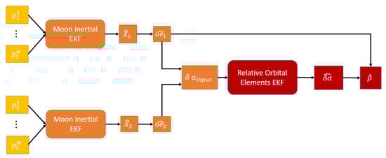 In ref. [11] an EKF for the estimation of the position and velocity of a satellite in a Moon inertial frame was presented. Even though it was demonstrated that the performance achieved is satisfactory even when very few ELFO satellites are in visibility (the reader can refer to following Section 6.1 for an example of the performance of the absolute navigation), the accuracy obtained by applying the same filter to the Chief and Deputy and simply differencing the estimates is not an advisable procedure if the focus is on the relative motion, i.e., on the estimation of the relative dynamics. Therefore, the problem was faced in ref. [7] by implementing a cascade filter architecture, in which the input to the second stage of the filter (dedicated to relative state estimation) is the output of the first stage filters (estimating the position of the two satellites in the Moon inertial frame), as shown in Figure 7. A brief explanation of this filter is reported in the following paragraphs since some concepts will be re-used for the newly developed filter that is the main objective of this research.