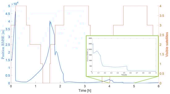 The time needed for achieving convergence mainly depends on the initial true anomaly of the ELFO satellites, allowing (or not) a full availability of the constellation in a short time. In Figure 9, the position error (obtained as the mean of the errors resulting from the Monte Carlo campaign) is plotted. It is possible to see that it is of the order of tens of kilometers for long latencies in availability, showing that the implemented UKF cannot converge if too few ELFO satellites are in visibility. The estimated error quickly improves when more satellites become available, ending with a very good accuracy after initialization, as depicted in the zoom-in Figure 9, with errors below 50 m. The convergence time is of the order of 4 h.