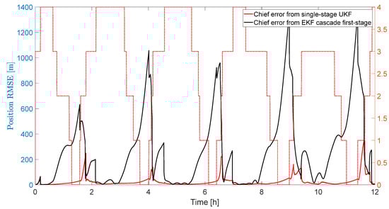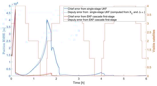 As a byproduct, also the inertial state of the Deputy (from the estimate of the inertial state of the Chief and the estimates of the relative orbital elements) can be computed, showing a very similar behavior. For comparison, the estimated position error norm of the Chief and Deputy obtained as the output of the first stage of the cascade filter is reported in Figure 10. Also in this case, the plotted curves are the result of the average of the results obtained by the two Monte Carlo campaigns (for the UKF and EKF cases). It is possible to see that the convergence is faster (about 2 h). However, the better performance on the inertial state of the two satellites does not produce a faster convergence in terms of relative orbital elements, which is the main objective of the current study.