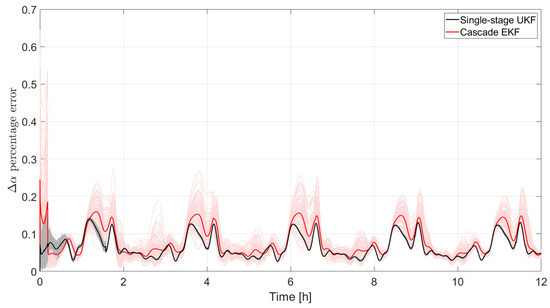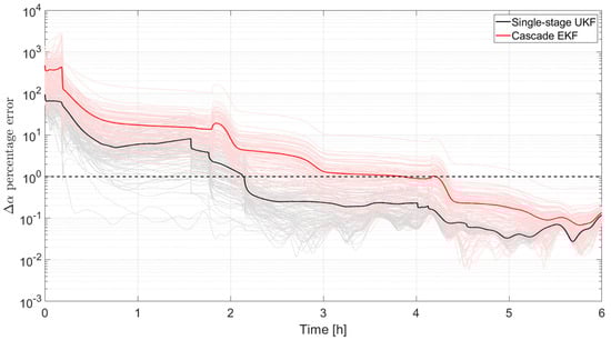 In Figure 11, the percentage of the error norm on the vector of the relative state vector is plotted for all the results obtained in the two Monte Carlo campaigns. The cascade EKF results are plotted in light red (with a bold red curve for the average value) while the single-stage results are plotted in a light curve (with a bold black curve for the average value). Considering the converge time as the time when the errors are consistently below the 1% value, it is possible to appreciate how the single-stage UKF converges much faster (approximately half of the time) than the cascade EKF.