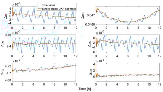 Figure 13 shows the true and estimated components of the vector obtained with the single-stage UKF. The presence of the gravitational and third-body perturbation produces oscillations in the values of the relative orbital elements, which the UKF is not able to capture. In fact, for simplicity, the relative dynamics is modeled as Keplerian. However, the lost information is of limited magnitude, as reported in Figure 14, where the percentage of the error norm on the vector of the relative state vector is plotted for all the results obtained in the two Monte Carlo campaigns; the color notation follows what indicated for Figure 11. It can be seen that the percentage errors are below 0.2% for both the single-stage UKF and the cascade EKF; however, the latter suffers from a much larger variability related to the random pseudorange noise, with errors that in the worst case reach 0.5%, more than double than the single-stage UKF.