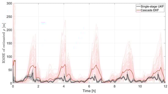 For a better practical understanding of the performance, this information is translated in relative position rather than relative orbital elements. The error norm obtained in the two Monte Carlo campaigns can be found in Figure 15 with the usual meaning of the colors. It is clear that the single-stage UKF outperforms the cascade EKF. Maximum errors can be as large as 300 m with this latter approach, while they reach 50 m in the newly proposed single-stage UKF. Also, for the relative distance estimate, it is confirmed that the cascade EKF suffers from a much larger variation among the different runs of the Monte Carlo campaign.