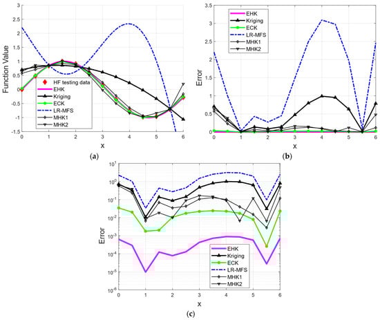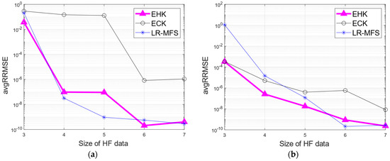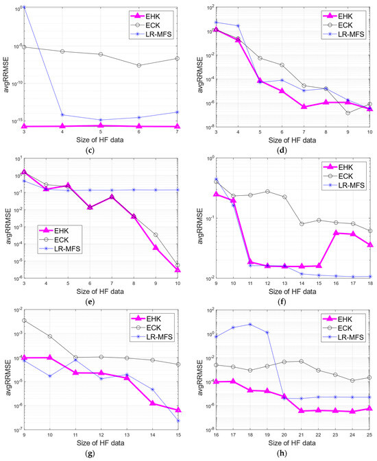 . These surfaces were constructed using 24 CFD samples and 2600 LF samples. The accuracy comparison between the EHK model and other models was performed over ten repetitions, each involving 24 CFD samples. Evaluation metrics such as avgRRMSE and avgRMAE are presented in