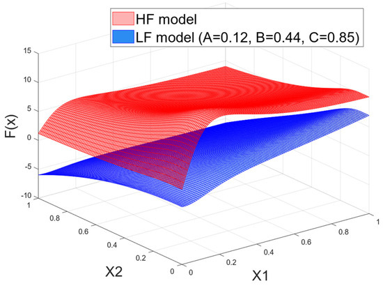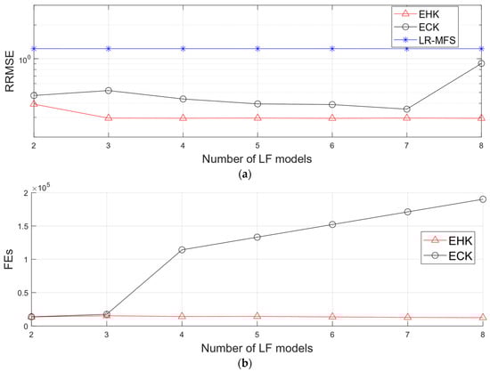 Furthermore, estimated scaling factors, denoted as and , associated with datasets T2,1 and T2,2, respectively, in different models were provided. It was observed that the values of were considerably larger than in all EHK, ECK, and LRMFS models, indicating that dataset T2,2 was assigned greater weight due to its higher fidelity. This correlation between the values of scaling factors aligned with the reported values of the correlation coefficients between the simulation datasets T2,1 and T2,2, and the experimental dataset T2,exp. Lastly, the metrics of RRMSE and RMAE indicated that the EHK model attained a slightly higher level of accuracy compared to the other approaches. In contrast, the LRMFS model exhibited the poorest performance, despite having the lowest cost of model processing. The EHK model’s reduction in the error metric RRMSE ranged from a maximal value of 84% to a minimal value of 5.35% when compared with the LRMFS and PC-DIT models, respectively. Regarding the RMAE metric, the comparison involved only the EHK, ECK, and LRMFS methods since no estimation of the metric for the WS, PC-DIT, and PC-CSC models was reported in the original work. The EHK model’s reductions in RMAE over the ECK and LRMFS models were 36.89% and 86.88%, respectively. These findings underscored the EHK model’s enhanced accuracy and efficiency in this particular analysis.