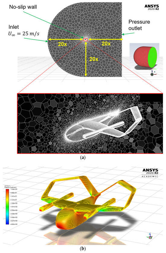 The three-dimensional compressible fluid flow is simulated using the Reynolds-averaged Navier–Stokes (RANS) equations, assuming incompressible flow due to the low Mach number achieved by the aircraft. For stall conditions, where the high angle of attack may lead to boundary layer separation on certain zones of the aircraft surface, an appropriate turbulence model capable of accounting for such separation is necessary. In this analysis, the shear stress transport k–ω turbulent model was employed to simulate the aerodynamics of the wing and the entire aircraft. The set of governing equations was solved in Ansys Fluent using the SIMPLE algorithm for pressure–velocity decoupling [