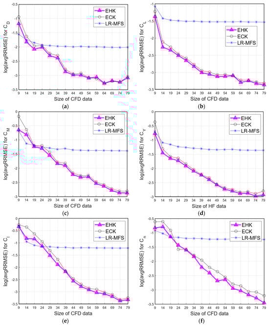 Figure 11 illustrates the initial sampling plan with 9 CFD points. Moreover, an additional 30 CFD points were randomly selected to validate the accuracy of the resulting models. An error comparison in terms of average RRMS between the EHK, ECK, and LRMFS models for aerodynamic coefficients regarding the number of CFD data points is shown in