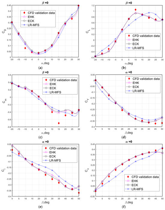 Generally, it is observed that the accuracy of the aerodynamic models by different methods was improved when the number of CFD points increased. The EHK models exhibited the best performances in approximating aerodynamic coefficients compared to the other models. The EHK and LRFMS models performed better than the ECK model when the number of CFD samples was less than 24 points. However, the LRMFS model’s accuracy was “saturated” after 24 CFD sample points. In contrast, the accuracy of the EHK and ECK models continued to be significantly improved when the number of CFD samples was higher than 24 points. With more than 24 CFD samples, the EHK model was slightly better than the ECK models in the approximations of . The EHK models significantly outperformed the ECK models for the approximations of and . Furthermore, the computational times recorded for the EHK, ECK, and LRMFS models across all testing cases were as follows: 15.388 s, 68.830 s, and 3.081 s, respectively.