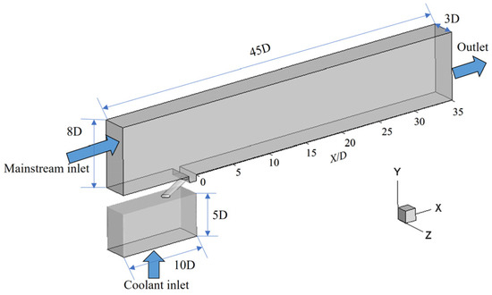 Figure 1 shows the physical model of the computational domain. The axial, normal, and spreading (X × Y × Z) dimensions of the main flow channel are 45 D × 8 D × 3 D, and the axial, normal, and spreading (X × Y × Z) dimensions of the compressor are 10 D × 5 D × 3 D. The ramjet only works effectively once the vehicle reaches a certain flight speed, and the compressor is added to the model to provide a steady stream of continuous coolant to the main flow channel. The origin of the coordinates is set at the center of the intersection line between the exit of the transverse channel and the wall in the exit direction. Also, to reduce the influence of the outlet environment on the fluid near the gas film orifice, the distance between the orifice and the transverse mainstream inlet along the X direction is set to 9 D.