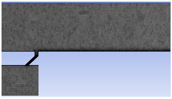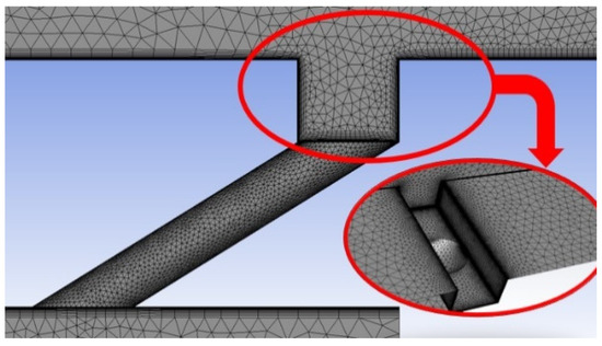 The y+ value of the boundary layer is about 1 to meet the requirement of the enhanced wall function, which can simulate the flow heat transfer process more accurately. The other areas in the flow field are divided using the tetrahedral mesh method. Due to the complexity of the flow near the gas film hole and the exit of the transverse groove, the locations near the gas film hole and near the boundary of the transverse groove are locally encrypted.