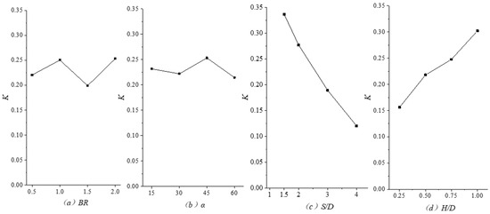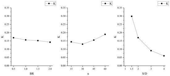 Figure 6 shows the trend of K for the three parameters. The results show that the K decreases with increasing BR as well as S/D. When α > 30°, the K increases with the increase of α. According to the selection principle of the parameters of the optim-case, the values of each parameter of the optim-case are BR = 0.5, α = 60°, and S/D = 1.5 in the study range of this study.