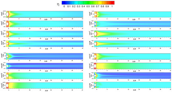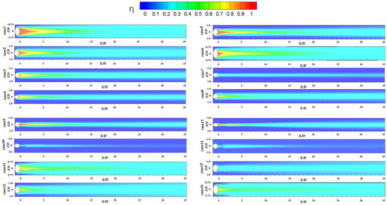 Figure 12 shows the XZ plane film cooling efficiency contours for 16 cases. The overall analysis of the 16 cases can be divided into three categories. The first category is the 10 cases with a protective film formed on the whole wall surface, including case1, case2, case5, case7, case8, case11, case12, case13, case14, and case16. The film cooling efficiency is uniform in the downstream region of X, which reaches 0.2 and above. The best ductility of Case14 in the X and Z direction can be clearly observed.