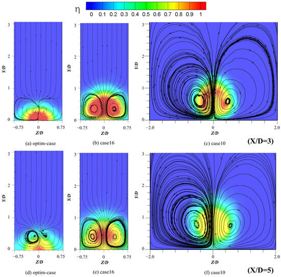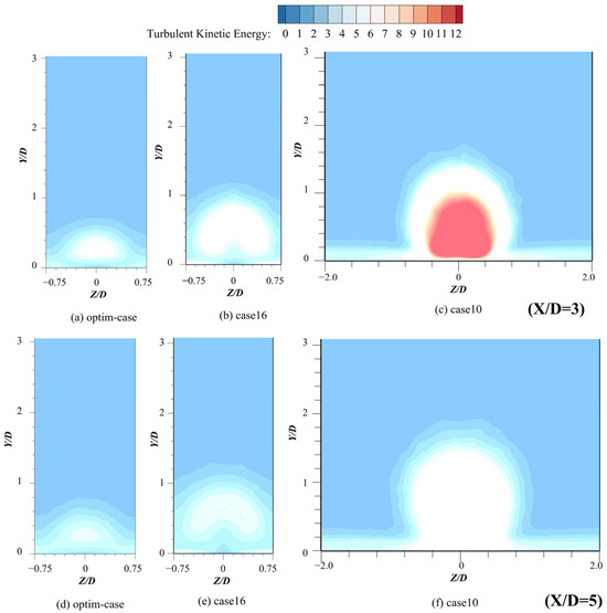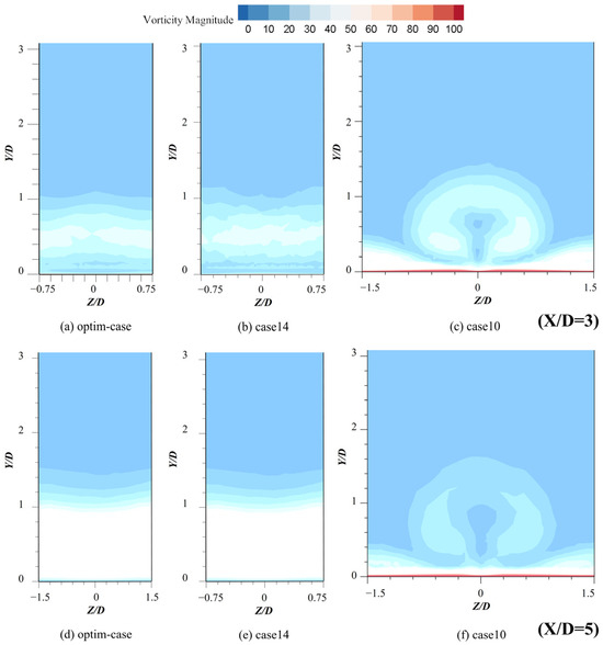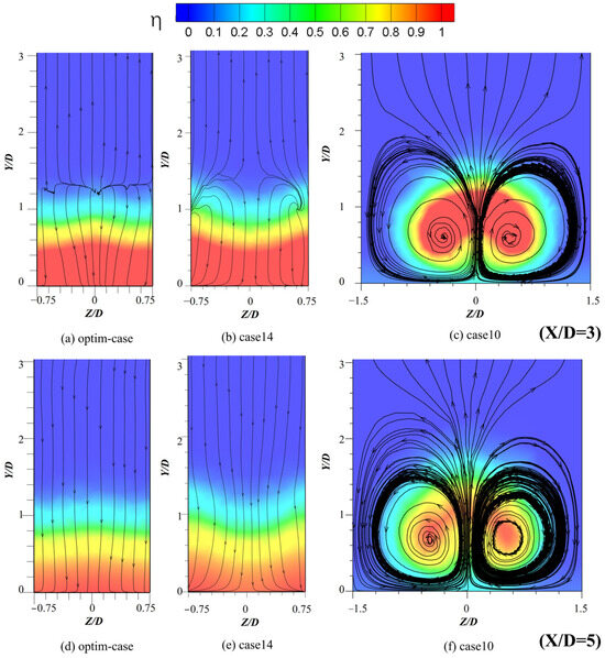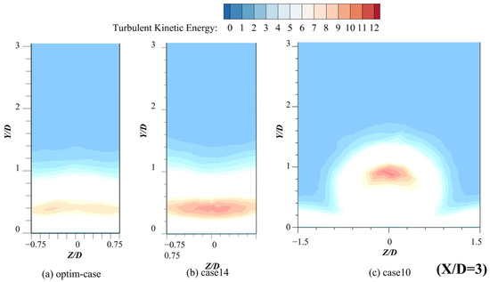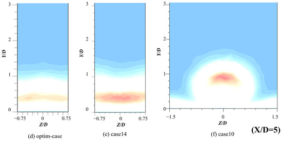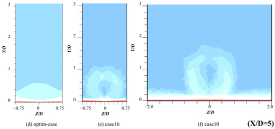 Figure 13, Figure 14 and Figure 15 show the streamline diagrams, the vorticity diagrams, and the turbulent kinetic energy diagram of the YZ section with X/D = 3 and X/D = 5. Firstly, it is obvious that the CRVP is generated in case10, which causes the coolant in case10 to be “sucked” in the central area, while the walls on both sides are basically uncovered. Because of the presence of CRVP, the film cooling efficiency is the lowest. On the contrary, the vorticity and turbulent kinetic energy of both the optim-case and case14 are more uniformly distributed in the Z-direction, and the flow lines are basically uniformly distributed along the opposite direction of the Y-direction. The cooling jets are better adsorbed on the wall surface, resulting in higher cooling efficiency.