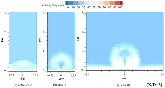 Figure 9, Figure 10 and Figure 11 show the streamline diagrams, the vorticity diagrams, and the turbulent kinetic energy diagram of the YZ section with X/D = 3 and X/D = 5 for the three special cases of flat plate film cooling. From Figure 9, it can be seen that a CRVP is generated in all three cases, but the flow field affected by the vortex rings is not the same, and the largest affected area appears in the flow field of case10.