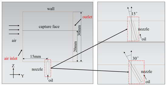 The air inlet has dimensions of 30 mm × 18 mm, and the nozzle is positioned at the center of the bottom wall of the computational domain, maintaining a distance of 15 mm between the nozzle and the air inlet. The nozzle length is 7.5 mm. The injection angle is defined as the angle between the centerline of the oil inlet and the z-axis in the y–z plane. Oil is injected into the opposite direction of the crossflow. The red dash box area in the image indicates the oil inlet. The range of injection angles is determined with the angles that result in higher oil collection efficiency in the radial oil collector. The tip of the oil-collecting ring blade rotates to form a lubricating oil capture surface, and the corresponding capture surface in the crossflow is determined based on the tip surface. For reference, the distance between the blade tip and the nozzle of a specific oil collector is 20 mm. The capture surface in transverse shear crossflow is located at z = 20 mm.