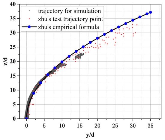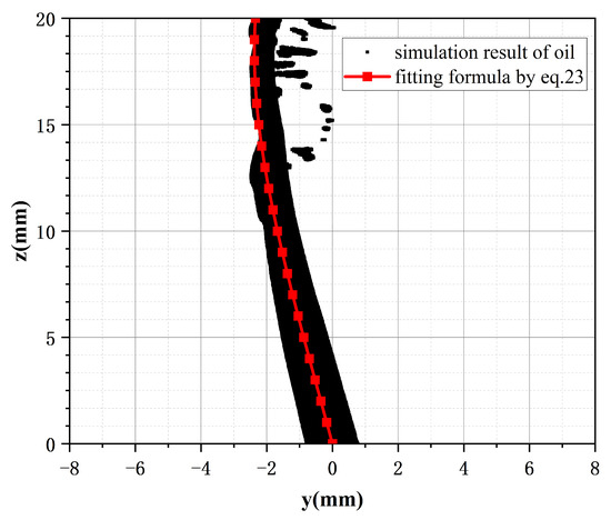 To verify the reliability of the calculation results, a working condition different from the data used for fitting was selected. The chosen working conditions are an injection angle of 10°, nozzle diameter of 1.5 mm, injection velocity of 20 m/s, and maximum crossflow velocity of 80 m/s. The calculation results and fitting curve are illustrated in Figure 22. The black dots in the figure represent the oil column when the LS function is greater than 0, and the red line is the lubricant center trajectory drawn with the obtained fitting formula Equation (23). The trajectory calculated with the fitting formula in the figure aligns well with the distribution range of the lubricating oil, demonstrating a good correlation between the lubricating oil trajectory and the fitting curve.
