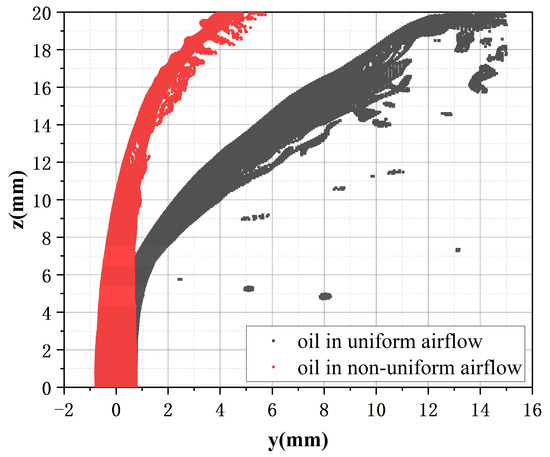 The oil jet is investigated under both uniform and transverse shear crossflow conditions. The injection velocity of the oil remains constant at 20 m/s. In the case of uniform airflow, the velocity is set at 120 m/s, while in the transverse shear crossflow field, the maximum velocity is also 120 m/s. Simulations of the lubricating oil jet were conducted in both scenarios, and the resulting jet trajectories are illustrated in Figure 4. It is evident that, due to the lower local airflow velocity, the deflection of the jet trajectory below a height of 8 mm is smaller than that of the oil trajectory in a uniform airflow. There is a notable difference in the oil trajectory between transverse shear and uniform airflow conditions.