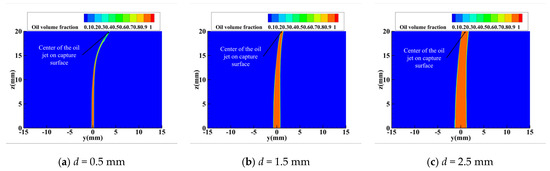 The oil injection velocity is 20 m/s, and the maximum crossflow velocity is 80 m/s with an injection angle of 0°. This study examines the impact of the nozzle diameter on the flow regime of the oil jet. As illustrated in Figure 5, the degree of oil trajectory deflection decreases with the increase in nozzle diameter. The center of the oil column on the capture surface advances as the nozzle diameter increases. With a constant injection velocity of oil and crossflow velocity distribution, the augmentation of the nozzle diameter results in a rapid increase in the mass flow rate of the lubricating oil, thereby weakening the acceleration effect of air on the lubricating oil. This observation is evident when comparing the oil volume fraction on the capture surface under various nozzle diameter conditions, as depicted in Figure 6. With an increase in the nozzle diameter, the shape of the oil column on the capture surface becomes more regular.
