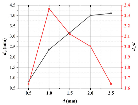 The liquid film width of lubricating oil represents the length of the oil surface in the x-axis direction when the Level Set (LS) function equals 0 at z = h. Figure 7 illustrates the relationship between the liquid film width of lubricating oil on the capture surface and nozzle diameter. As the nozzle diameter increases, the liquid film width of the lubricating oil column also increases. When the nozzle diameter surpasses 2 mm, the change in the liquid film width of the oil column becomes less pronounced. Moreover, the ratio of liquid film width to nozzle diameter decreases with increasing nozzle diameter. This indicates that the influence of the nozzle diameter on the liquid film width of lubricating oil diminishes, and the liquid film width of oil approaches the nozzle diameter. This phenomenon indicates that the deformation of the oil jet liquid column in transverse shear crossflow decreases as the nozzle diameter increases. Subsequently, a diameter beyond 2 mm has little impact on the jet liquid column.