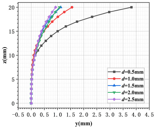 In the investigation of jet breakup in uniform airflow, researchers usually mark the upper boundary of the fluid in crossflow as a trajectory. However, the centerline trajectory of the oil column on the center plane can better reflect the displacement of the oil column and the position that the liquid column can reach on the capture surface. As shown in Figure 8, the distribution of center trajectories of lubricating oil with different diameters is given. At the same injection velocity and crossflow distribution, the center position of the oil on the capture surface is away from the vertical line of the nozzle center when the nozzle diameter is less than 1 mm. When the diameter increases from 1.5 mm to 2.5 mm, the change in the oil trajectory is relatively small. When the nozzle diameter is greater than 1.5 mm, increasing the nozzle diameter has little effect on the stability of the lubricating oil jet.