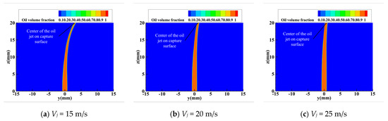 The oil center trajectories at different injection velocities are illustrated in Figure 12. When the injection speed of oil is less than 15 m/s, the oil column deflects significantly. Conversely, when the oil injection velocity exceeds 25 m/s, the change in the y-axis direction of the capture surface center trajectory does not exceed the nozzle radius.