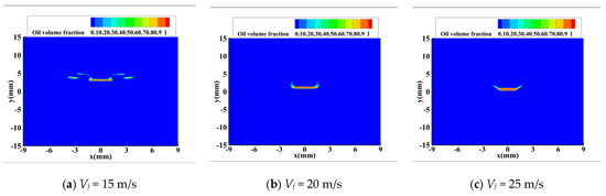 The maximum velocity of the crossflow is 80 m/s, the nozzle diameter is 1.5 mm, and the injection angle is 0°. The injection velocity varies from 10 m/s to 25 m/s. As the injection velocity increases, the initial momentum of the lubricating oil column also increases. Figure 9 illustrates the distribution of lubricating oil on the center plane under three injection velocities. With the rising injection velocity, the initial momentum of the lubricating oil column increases, resulting in a shorter time for the oil to reach the same height. The acceleration effect of aerodynamic force weakens, and the deflection degree of the lubricating oil column decreases. When the injection velocity of the lubricating oil is less than 15 m/s, there is a significant disturbance in the lubricating oil column, and the position of the oil on the capture surface fluctuates considerably over time. As depicted in Figure 10, as the injection velocity of the oil increases, the shape of the oil on the capture surface regresses from a flat film shape to a meniscus shape, indicating a weakening influence of aerodynamic forces.
