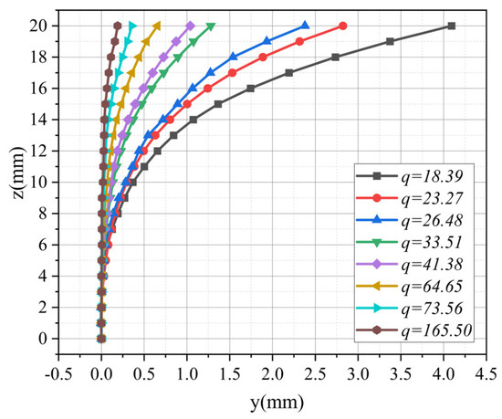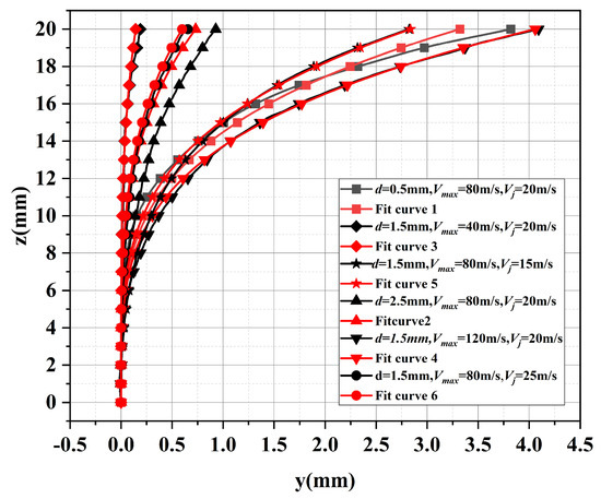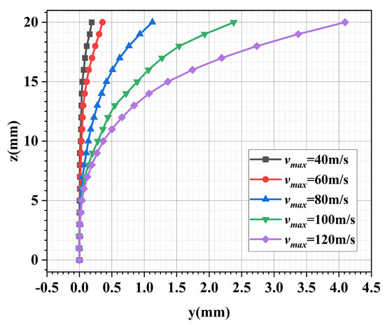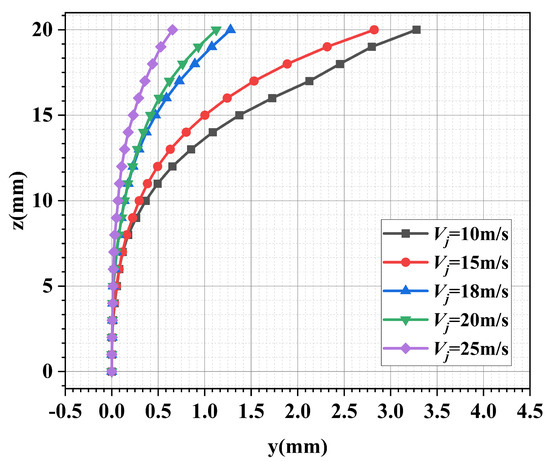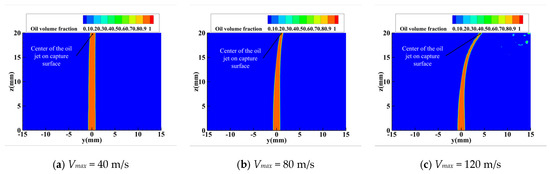 The center trajectories of lubricating oil with different crossflow velocity distributions are shown in Figure 16. When the maximum velocity of the airflow is less than 60 m/s, the deflection of the oil column on the y-axis is less than the radius of the nozzle, and the jet experiences a bit of deflection. However, when the maximum velocity of the airflow exceeds 100 m/s, the deflection of the lubricating oil column on the capture surface on the y-axis increases rapidly.