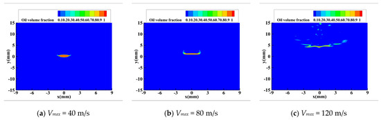 The oil injection velocity is 20 m/s, the nozzle diameter is 1.5 mm, and the injection angle is 0°. The maximum velocity of the crossflow varies from 40 m/s to 120 m/s. The maximum oil/air momentum ratio varies from 18.39 to 165.50. In linearly transverse shear crossflow, when the height (h) and the maximum velocity (Vmax) of the crossflow are determined, the velocity distribution of the crossflow is also established. As depicted in Figure 13, the aerodynamic resistance in the crossflow increases, leading to an increase in the deflection of the lubricating oil column when the maximum velocity of the crossflow increases. When the maximum crossflow velocity is less than 80 m/s, the deflection of the lubricating oil column is minimal. However, under the working condition of a maximum crossflow velocity of 120 m/s, the disturbance of the tail surface of the lubricating oil column increases, and more surface peeling-off of the lubricating oil occurs. Similarly, statistical analysis was performed on the distribution of lubricating oil on the capture surface. Figure 14 shows that, when the maximum crossflow velocity is 40 m/s, the surface shape of the lubricating oil column exhibits a semi-lunar shape. As the crossflow velocity increases, the cross-section of the lubricating oil column on the capture surface is compressed and elongated, ultimately presenting a bag-like shape.