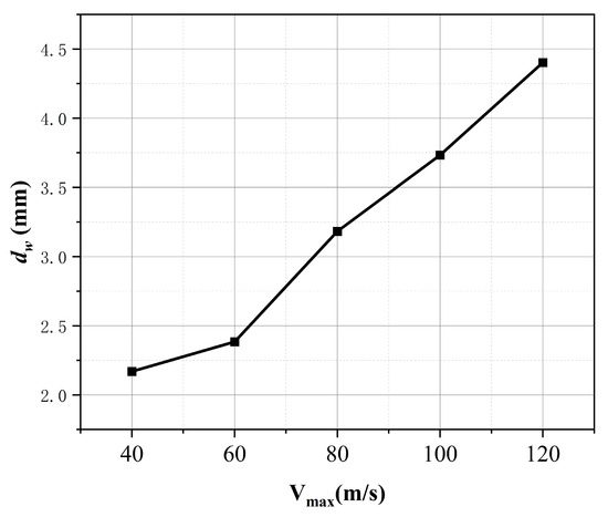 The relationship between the liquid film width of the oil column and the maximum crossflow velocity is depicted in Figure 15. The liquid film width of the oil column increases with the maximum velocity of the crossflow under the specified calculation conditions. When the maximum velocity of the crossflow surpasses 120 m/s, the oil column on the capture surface exhibits significant fluctuations, and the oil column is noticeably broken. However, it is important to note that the lubricating oil column will experience breakage, leading to a decrease in the liquid film width of the oil column when the crossflow velocity further increases.