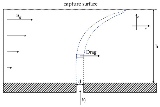 The deflection of the oil column in the downstream direction of the jet is evidently attributed to aerodynamic drag. In this study, a phenomenon analysis approach is employed to establish simple correlations, avoiding the need to solve precise and complex control equations. The analysis focuses on balancing the liquid acceleration and air resistance in the crossflow direction to analyze the motion trajectory of the oil column. The force on the liquid column is shown in Figure 18. The deflection trajectory of lubricating oil in linear transverse shear crossflow is subsequently derived, building upon previous research [25].
