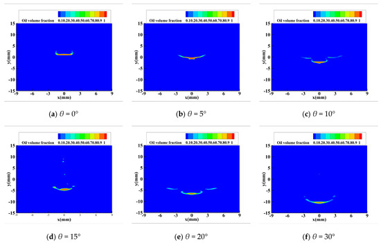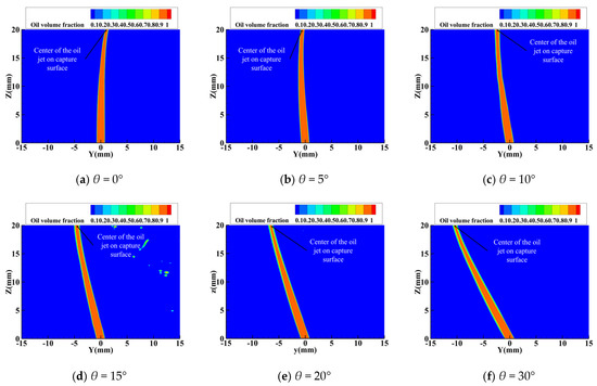 The oil injection velocity is 20 m/s, the nozzle diameter is 1.5 mm, and the maximum velocity of the crossflow is 80 m/s. The injection angle varies from 0° to 30°. The injection angle of lubricating oil directly influences the initial velocity components of the oil jet in the y-axis and z-axis directions. With an increasing injection angle, the relative velocity of the lubricating oil to the crossflow in the y-axis direction rises, while the initial velocity component along the vertical crossflow direction decreases. The results are depicted in Figure 20. Within the calculation range, as the oil injection angle increases, the position of the oil on the capture surface gradually shifts from downstream of the nozzle to upstream of the nozzle. Figure 21 illustrates the distribution of oil on the capture surface at different injection angles. Across the injection angle range, the shape of the lubricating oil undergoes a transition from a liquid film shape to a crescent shape and then back to a liquid film shape. Notably, when the nozzle angle is between 10° and 20°, surface fragmentation occurs on both sides of the oil jet column.