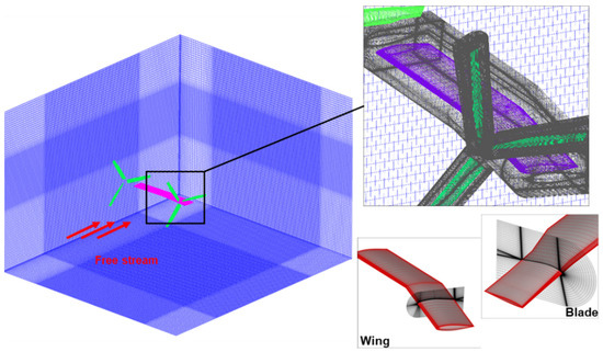 The flow field is divided into two parts: one is close to the body surface, and the other one is the peripheral fluid region. The peripheral region consists of a background mesh (including fine-mesh and coarse-mesh regions), the central scheme is used for spatial discretization, and the RK scheme is used for time discretization. In contrast, the near-body region uses the Roe scheme with the LUSGS scheme and the SA turbulence model. The SA turbulence model is widely used in rotor flow field simulation and also meets the needs of CFD/CSD coupling simulation. For example, Smith used it in the CFD/CSD coupling simulation of Hart II, which shows good accuracy [28]. In addition, the interaction of the rotor and wing is considered via overset interpolation in the present simulation.