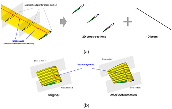 The blade structure model comprises a two-dimensional linear section analysis and one-dimensional nonlinear beam analysis, as shown in Figure 4. The surface grid points are distributed in the cross-sections. This scheme balances computational accuracy and efficiency; the principle can be found in reference [29]. This differs from the method of calculating wing deformation using computational finite elements with structural mesh [30].