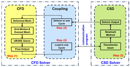 This paper adopts a loose coupling strategy [18,20,37] to achieve the coupling calculation between CFD and CSD, and the established coupling process is shown in Figure 6. It is mainly divided into four steps.