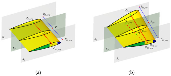 (4) Obtain deformed mesh via deformation information. Calculate each node point’s coordinates for each azimuth after deformation using the endpoints’ displacement and rotation information. The grid nodes located in the middle of the segment can be obtained through linear interpolation of displacement and rotation at the segment of two ends. As shown in Figure 7, the position of the deformed grid points is determined based on the deformation of the two segment endpoint’s cross-sections where they are located. In the figure, grid point corresponds to cross-section (with spanwise ), located between cross-sections and (with spanwise and ). It is projected onto the original cross-sections and as points and , respectively. As the cross-sections and deform, they become and , and the position after deformation is . Specifically, the points located inside the blade root or outside the tip are determined by the segment endpoint’s cross-section of the blade root or tip, respectively. Also, the relationship between them and the cross-section of the root or tip remains unchanged after the deformation of the blade.