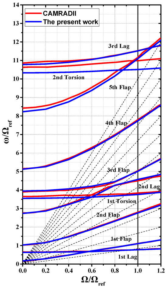 The structural characteristics validation calculations were conducted on the Bo-105 blade. Figure 8 compares the calculated values of the blade resonance diagram in this article and the calculated values of CAMRAD II [28]. It can be seen that the resonance diagram calculated in this article is in good agreement with the calculated values of CAMRAD II, and the characteristic is that it completely coincides with the curve of CAMRAD II in the low-frequency region that has a significant impact on the inherent characteristics of the blade. Figure 9 compares the calculated vibration mode curve of this article with the computed values of the AFDD-1 project [28], and it can be seen that the CSD method in this article can effectively predict the blade vibration mode curve. The slight differences may be due to differences in structural segment numbers compared to the references.