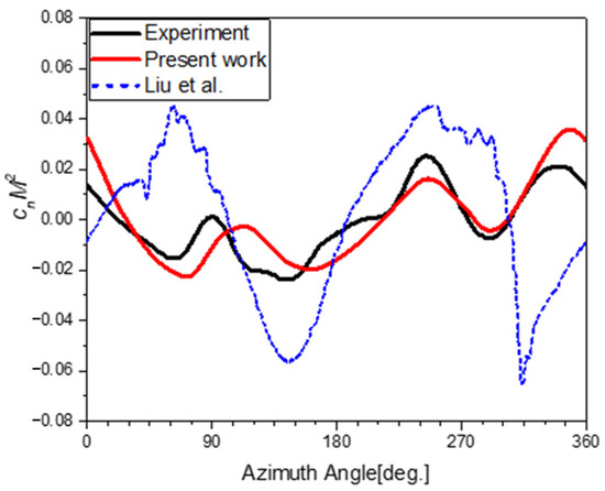 The forward flight test state of the Hart-II rotor [36] is used to verify the effectiveness of the CFD/CSD aeroelastic coupling method established in this article. The rotor of this model is composed of four hinge-free Bo-105 blades with a radius of 2 m and a chord length of 0.121 m. The airfoil uses NACA13012, with a linear twist of −8° and a rotor axis rake angle 2.5°. This paper calculates the experimental state with a forward ratio of 0.151 and a blade tip Mach number of 0.639, including higher order control harmonics. Figure 10 compares the calculated value of the 0.87R section normal force coefficient obtained after 10 cycles of aeroelastic coupling calculations and the experimental value [28], and both the calculated and experimental values have been averaged. Compared with a previous study by Liu et al., which only focused on significant trends, the results of the present coupling method are more consistent with the experimental values. Still, on the latter side, ψ = 0°. The calculated value at around 0° is slightly higher, possibly due to the trailing blade’s severe stall. The CFD solver needs to consider both the reflux and low-pressure regions, resulting in a deviation between the calculated results and the experimental values.