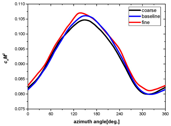 We built three grid systems to verify the independence of the grid. The grid element numbers of coarse, baseline, and fine systems are shown in Table 1. The normal force coefficients of the three systems are compared, as illustrated in Figure 11. The results verify the independence of the grid and baseline grid systems used in this study, and no obvious difference was observed between all three meshes. Moreover, considering that the calculation of blade CSD mainly focuses on the in-plane load, even a coarse mesh can ensure good simulation results. In similar rotor CFD/CSD simulations by Liu et al. [42], usable results were also obtained on the 5 million grid.