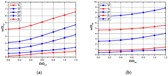 Frequency diagram of the soft in-plane and stiff in-plane blades predicted by the CSD analysis: (a) soft in-plane; (b) stiff in-plane.