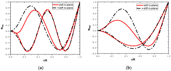Figure 12 compares the frequency diagrams of soft in-plane and stiff in-plane blades. Since the impact of lower order frequency vibration is larger than that of higher order, only the lowest modal frequencies are shown as a function of rotational speed. The comparison in the figure reveals that due to the different flapwise bending stiffness of the soft in-plane and stiff in-plane blades, the flap frequency has changed greatly; however, due to the existence of the flap–lag coupling vibration, only the bending stiffness in the flapwise direction is changed, and the lagwise frequency curve also changes to a small extent. Figure 13 shows the modal shape diagrams of the third and fourth orders of lead–lag modes and the second and third orders of flap modes. From the comparison of the soft in-plane and the stiff in-plane blades, the node positions of the modes do not change greatly, but the difference in the structural characteristics of the blade leads to a large change in the amplitude of the modal shape. In particular, the extreme value point of the third flap modal shape is around 0.4R, whereas the figure of the soft in-plane blade is about 47% of that of the stiff in-plane blade.