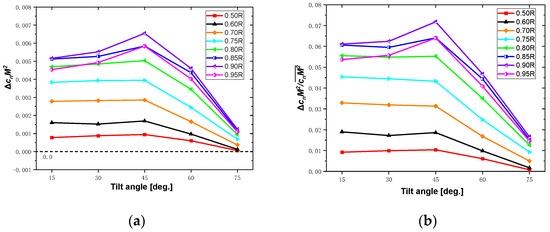 Figure 14a shows the variation in the difference in the normal force coefficient of soft in-plane and stiff in-plane blades on spanwise positions as a function of the tilt angle, and Figure 14b shows the relative difference which is the ratio of the normal force coefficient to the mean value of soft in-plane and stiff in-plane blades to analyze the influence of structural characteristics on the variation in thrust around a revolution. The results show that the difference in the normal force coefficient is larger near the blade tip, while at section 0.5R, closer to the blade root, the difference between the soft in-plane and stiff in-plane blades’ normal force coefficient is small. At a tilt angle of 75°, the relative difference is only 0.077%.