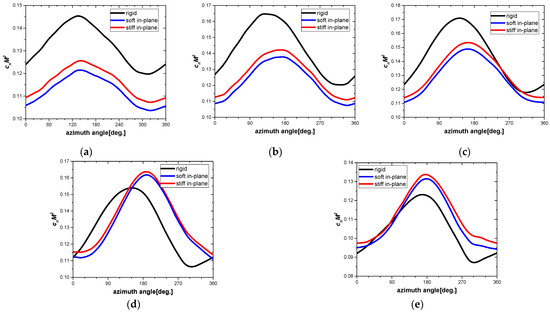 Comparison of normal force coefficient of rigid, soft in-plane, and stiff in-plane blade at section 0.75R: (a) τ = 15°; (b) τ = 30°; (c) τ = 45°; (d) τ = 60°; (e) τ = 75°.