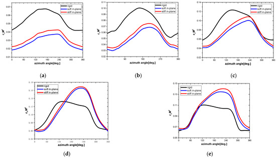 Comparison of normal force coefficient of rigid, soft in-plane, and stiff in-plane blade at section 0.95R: (a) τ = 15°; (b) τ = 30°; (c) τ = 45°; (d) τ = 60°; (e) τ = 75°.