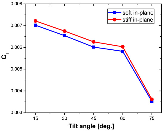 Figure 17 shows the variation trend of the soft in-plane and stiff in-plane blades’ thrust coefficients with pitch angle. In the conversion flight, the thrust of the stiff in-plane blade is always greater than that of the soft in-plane blade. The difference between the thrust of the two blades at a tilt angle of 15°–60° remains basically unchanged. At 60°–75°, there is a rapid drop in thrust, and the thrust of the soft in-plane and stiff in-plane blades at a tilt angle of 75° is basically equal, with a difference of about 2.5%.