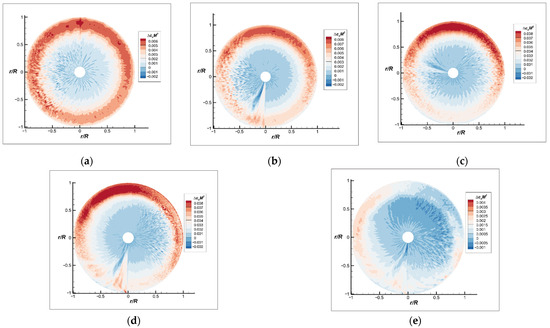 Figure 18 shows the distribution of the difference in the normal force coefficient of the soft in-plane and stiff in-plane blades at various positions of the rotor disc. The incoming flow is from directly below (180° azimuth) to directly above (0° azimuth). The figure shows that when the tilt angle is 15°, the part with a large difference in normal force is roughly distributed in the ring area of 0.7R–1.0R. As the tilt angle increases to 60°, the difference between the two blades around the 180° azimuth becomes more and more prominent. At a tilt angle of 75°, the normal forces of the soft in-plane and stiff in-plane blades tend to be equal. The difference in normal force at each position of the rotor disc is small, which is consistent with the change in the tension coefficient in Figure 17.
